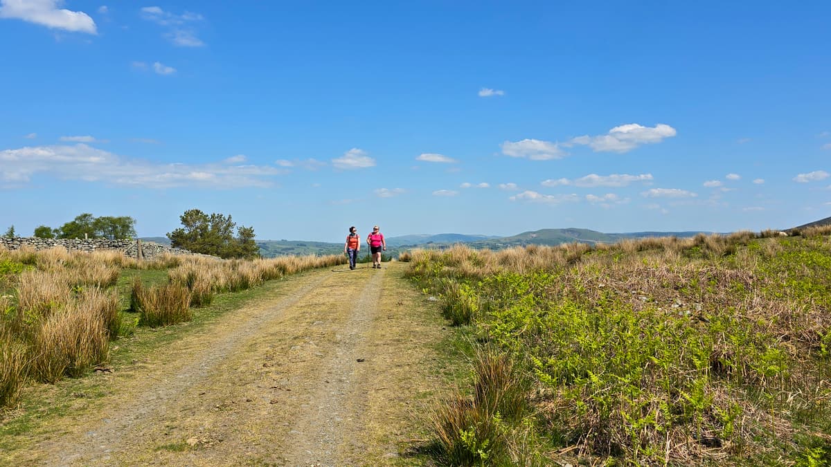 When you reach the junction of tracks, turn left, following the main track as it curves across the flat moorland. Go through a gateway and continue in the same direction, through a gated farmyard at Cefn. The view opens out after the second gate and the track starts descending. Stay on this track, where there may be gates to open and close (being sure to leave the gates as you found them), until you reach a gate which opens onto a road. Turn left along the road and then turn right straight away down a narrow path that comes out onto another road. Here you turn left and walk into Llanwrthwl.