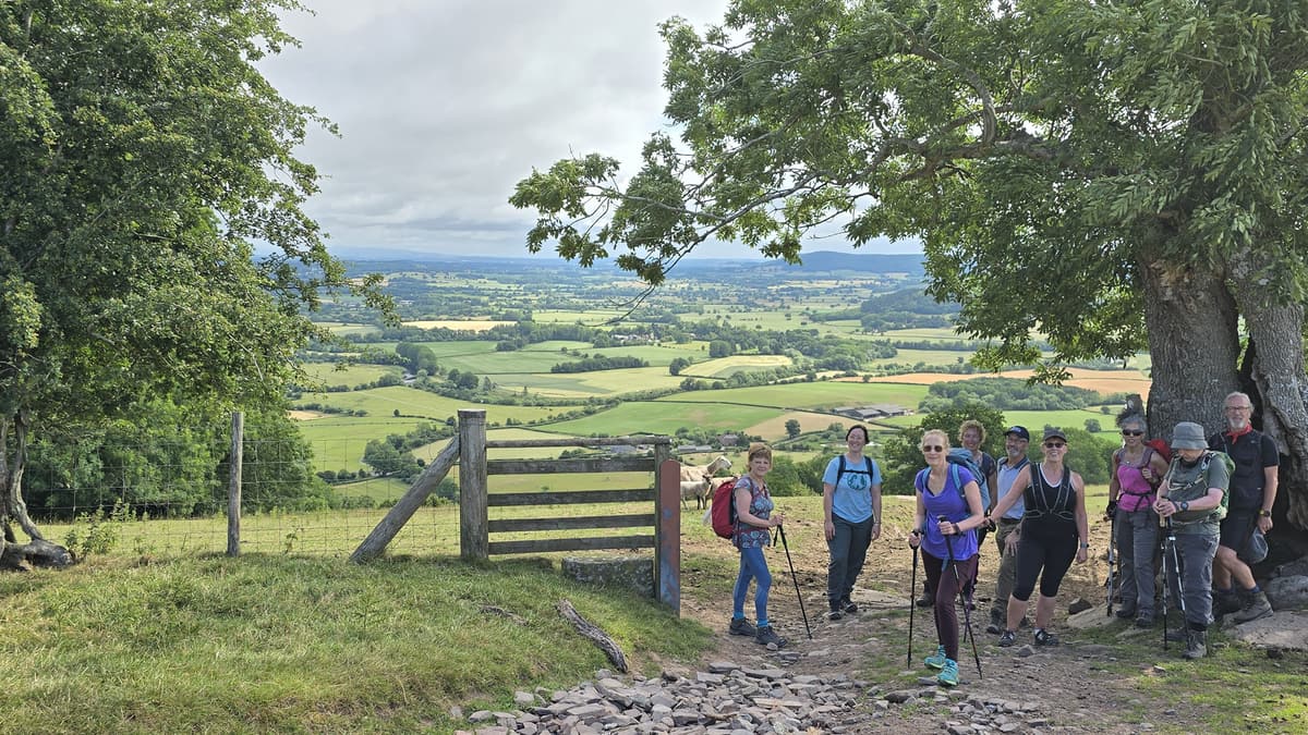 After another uphill section the path flattens out and you turn left at the junction by a Wye Valley Walk marker (SO 304 447), where the Herefordshire Trail continues to the right to the top of Merbach Hill. But it would be a shame to miss the panoramic views from Merbach Hill so it is worth taking a short ‘there and back’ detour here, along the Herefordshire Trail to the trig point, which is to the left when you reach the summit.